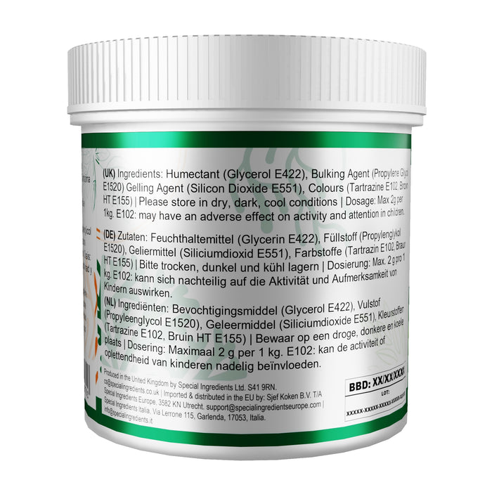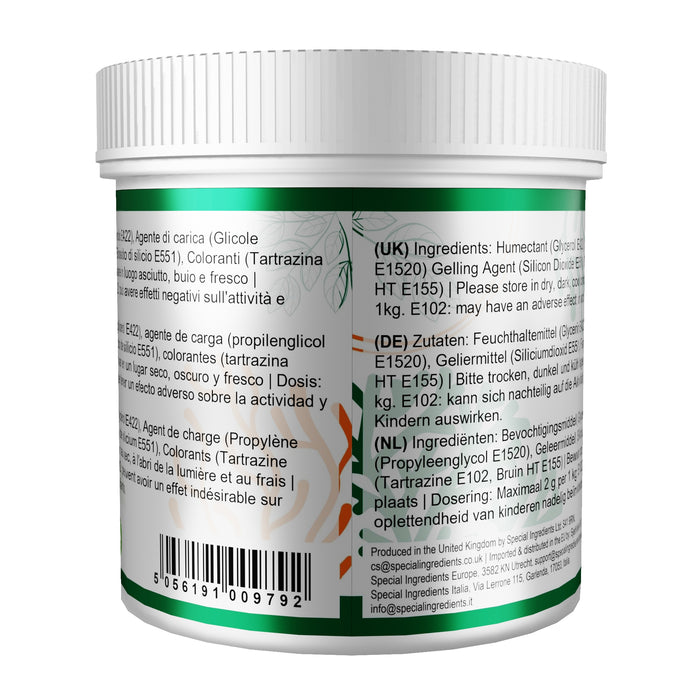 Ingredients: Humectant (Glycerol E422), Bulking Agent (Propylene Glycol E1520) Gelling Agent (Silicon Dioxide E551), Colours (Tartrazine E102, Brown HT E155). E102: may have an adverse effect on activity and attention in children.