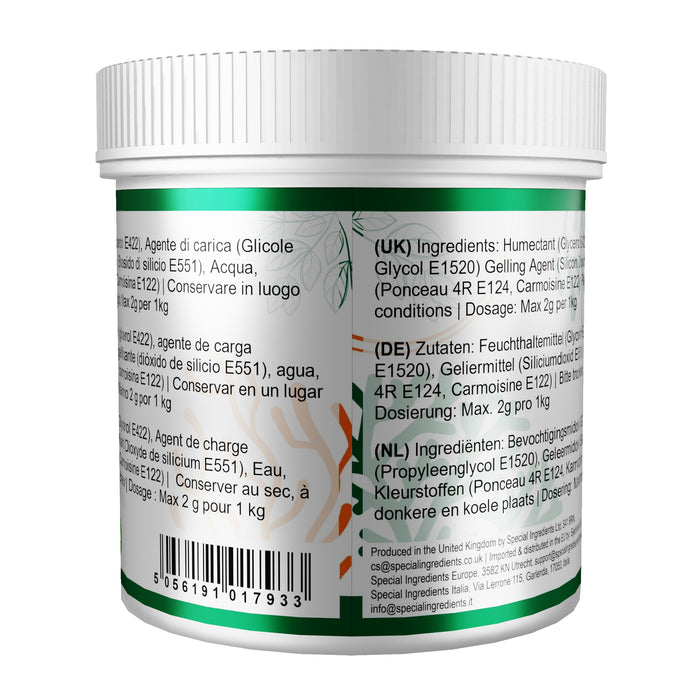 Ingredients: Humectant (Glycerol E422), Bulking Agent (Propylene Glycol E1520) Gelling Agent (Silicon Dioxide E551), Water, Colours (Ponceau 4R E124, Carmoisine E122). E122, E124: may have an adverse effect on activity and attention in children.