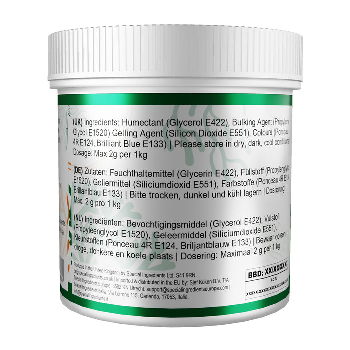 Ingredients: Humectant (Glycerol E422), Bulking Agent (Propylene Glycol E1520) Gelling Agent (Silicon Dioxide E551), Colours (Ponceau 4R E124, Brilliant Blue E133). E124: may have an adverse effect on activity and attention in children.