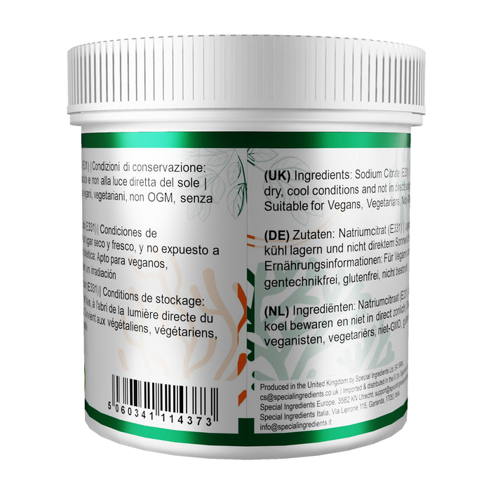 Sodium Citrate ( Buffer Salt ): Sodium Citrate is the sodium salt of Citric Acid. Like Citric Acid and other salts, it has a sour and salty taste. It is commonly known as sour salt, buffer salt or trisodium citrate and is mainly used for flavouring food and drinks or as a preservative. A useful quality of Sodium Citrate is that it reduces the acidity of foods and liquid solutions, so it allows spherification and reverse spherification with strongly acidic ingredients. Sodium Citrate is also used as an antioxidant in food as well as a sequestrant. It dissolves easily and acts instantly. A highly soluble powder. Suitable for Vegans, Vegetarians, Non-GMO, Gluten Free, Non-Irradiated.