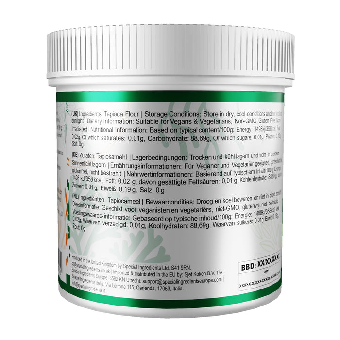 Tapioca Flour | Starch: Our Tapioca Flour is a premium quality fine white powder. Also known as Tapioca Starch. A natural product ground from the Cassava plant roots. It is ideal for anyone on a Gluten free diet and contains no fat or cholesterol. It is low in Sodium and contains iron and calcium. Also used as a thickener in pies, sauces and soups and will give a glossy finish. It is used as a binding agent in Gluten free recipes and can be mixed with other flours to make pastry, bread and cakes which are Gluten free. Suitable for Vegans & Vegetarians, Non-GMO, Gluten Free, Non-Irradiated.