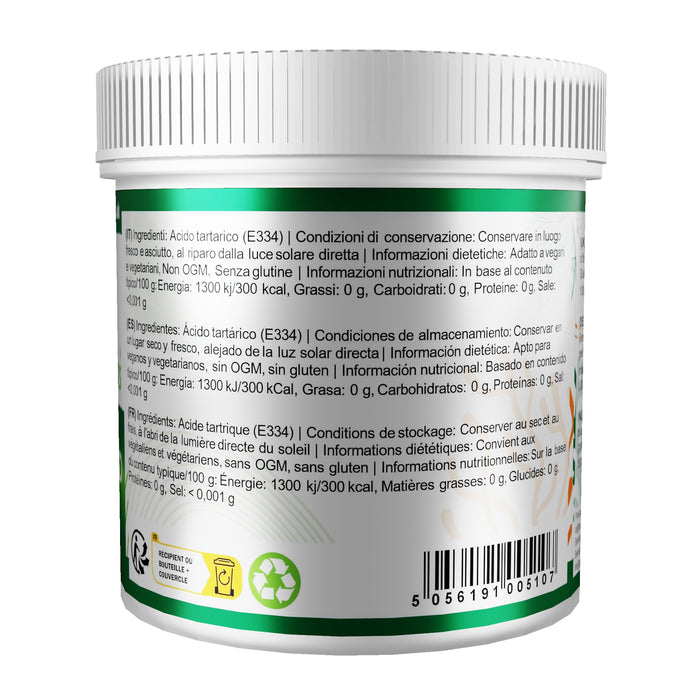 Tartaric Acid: Our Tartaric Acid is a premium quality, white, odourless crystalline powder with a slight tart taste. Tartaric Acid is very versatile and can be used as an emulsifier, bulking agent, acidifying agent and dough conditioner. Use in a variety of ways such as improving the quality and increasing the shelf life of cheese and tofu, adding to pate de fruit or jams to activate Pectin, adding to baked goods as a leavening agent to improve the quality and colour of flour. It also interacts with gelling agents to strengthen food structure and is commonly used in winemaking to maintain colour, stability and taste. Suitable for Vegans & Vegetarians, Non-GMO, Gluten Free.