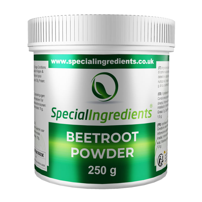 Beetroot Powder: Our Beetroot Powder is a premium quality, rich refined, spray-dried powder. Ideal for colouring foods or flavouring. It has a characteristically sweet flavour and has many applications, including adding to smoothies, juices, water, curries, marinades, rubs, dips, cakes, biscuits, bread, pasta, soups, sauces, mousses and many more. It can be used to add deep colour to your cooking, and you can sprinkle it on anything you feel it would enhance. It has many uses, is very nutritious and is a great food supplement. Be adventurous and try adding it to your recipes. Suitable for Vegans & Vegetarians, Non-GMO, Gluten Free, Non-Irradiated.