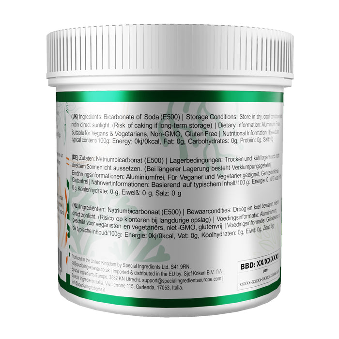 Bicarbonate of Soda: Our Bicarbonate of Soda (Sodium Bicarbonate) is 100% extra fine pure powder and is aluminium free. Also known as "Baking Soda", it is primarily used in cooking and baking as a leavening agent. It reacts with acidic components in batters, releasing carbon dioxide, which in turn causes expansion of the batter forming the characteristic texture and grain in pancakes, cakes, quick breads and other baked and fried foods. Acidic compounds that induce this reaction include phosphates, cream of tartar, lemon juice, yoghurt, buttermilk, cocoa, vinegar, etc. Sodium Bicarbonate can be substituted for baking powder provided sufficient acid reagent is also added to the recipe. Most forms of baking powder contain Sodium Bicarbonate combined with one or more acidic phosphates. Suitable for Vegans & Vegetarians, Non-GMO, Gluten Free.