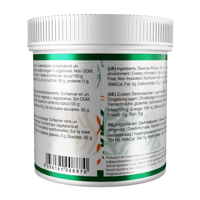 Dextrose Powder: Our Dextrose Powder (also known as Grape Sugar) is a premium quality refined powder, a natural occurring form of glucose which is a simple monosaccharide found in plants. It has a wide variety of uses which include adding to juices, shakes, cocktails and beverages. Use in cakes and baking to replace sugar (it is 70% as sweet as basic sugar) and is very hygroscopic. It provides flexibility to fondant icing and inhibits crystallization in ice creams and sorbets and has a high Glycaemic Index. Suitable for Vegans & Vegetarians. Non-GMO, Gluten Free, Non-Irradiated.