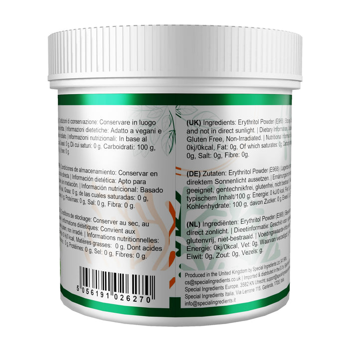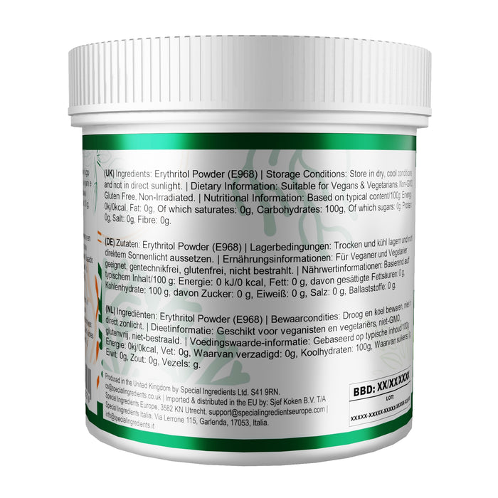 Erythritol Powder: Our Erythritol Powder is a premium-grade, ultra-fine sweetener produced through natural fermentation of plant-based sugars. With approximately 70% of the sweetness of regular sugar but with zero calories, it is an ideal choice for anyone seeking a healthier alternative without compromising on taste or performance in recipes. Erythritol has a clean, neutral sweetness with no bitter aftertaste. The texture of our erythritol closely resembles that of icing sugar, making it particularly effective for applications where a smooth, uniform consistency is desired. It dissolves extremely quickly in both hot and cold liquids, making it ideal for beverages, frostings, and glazes, where immediate solubility is important. Its stability under heat and low moisture absorption also make it a great ingredient for baked goods, drinks, meringues, sauces, glazes, syrups, confectionery, chocolate, ice creams and much more.