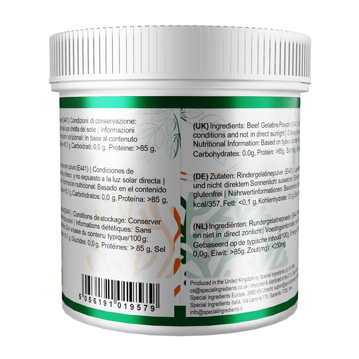Gelatine: Our Beef Gelatine is a premium quality instant Gelatine Powder and has a bloom of 240 which creates firm gels in recipes which requiring setting. The Beef Gelatine Powder can also be used to clarify products such as stocks and glazes. Gelatine creates clear, colourless & flavourless gels, not impacting the organoleptic qualities of your products. It is a versatile thickener, stabilizer and texturiser that mixes instantly and is vital for jellies, souffles, cheesecakes and mousses. Used as a thickener in stews, custards, drinks and more. Being a powder, it is quick and easy to use. It is often used to increase Collagen intake by individuals on a daily basis. Non-GMO, Gluten Free.