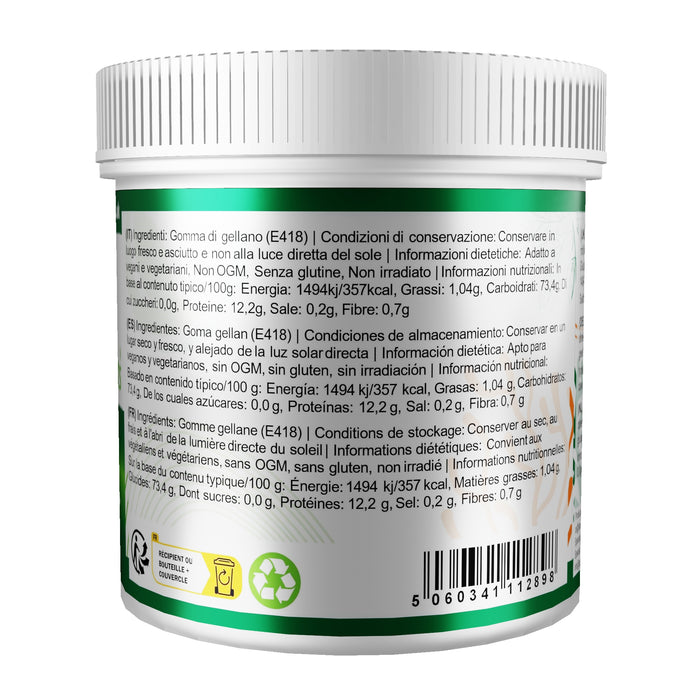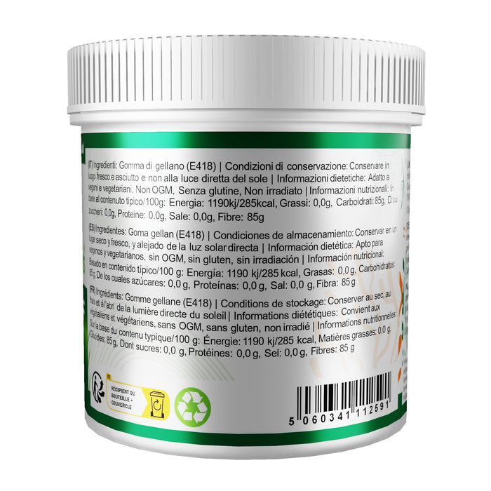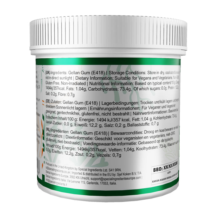Gellan Gum Type F ( Low Acyl ): Our Gellan Gum is a premium quality refined powder. Gellan Gum Low Acyl is the most popular type of Gellan, also know as Gellan Gum Type F. It is a multi-functional gelling agent and thickener, producing firm gels with perfect visual clarity. Gellan Gum Low Acyl can also be used in lower concentrations to produce fluid gels, pastes and to thicken liquids. It gives outstanding flavour release. Used as a superior alternative to Agar Agar and vegetarian substitute Gelatine. The main advantages over Agar Agar are its high gel strength, excellent stability and producing a perfect visual clarity gel that can withstand temperatures up to 120ºC. Gellan Gum gels are stable in solutions ranging from 3.5 - 8.0ph making them suitable for a wide range of applications, they can be combined with various gelling agents to improve strength and texture. Gellan Gum Low Acyl can be used individually, or with other products. Combining it with other gelling agents opens a wider selection of gel strengths and textures. Suitable for Vegans and Vegetarians, Non-GMO, Gluten Free, Non-Irradiated.