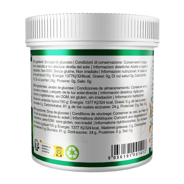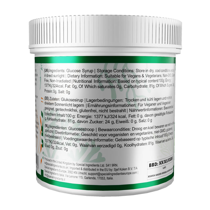 Glucose Syrup: Our Glucose syrup (sometimes referred to as Corn Syrup) is a premium quality, natural, simple liquid sugar product, free from artificial colours and flavours. Glucose Syrup is very versatile, mainly used together with sugar as a sweetener it will improve the colour, flavour, texture and stability of many foods. It is odourless and can be used in a variety of baking products including cakes, desserts, confectionery, preserves and jam making. Used in jams and fruit preparations it will improve the taste of the fruit and its stability. It is an essential product for ice cream and royal icing as it will enhance the softness, it will also help to keep cakes soft, moist and spongy. It can be added to drinks to sweeten and enhance the flavour and will mix easily with various food ingredients. Our Glucose Syrup has a DE value of 42. Suitable for Vegans & Vegetarians, Non-GMO, Gluten Free, Non-Irradiated.