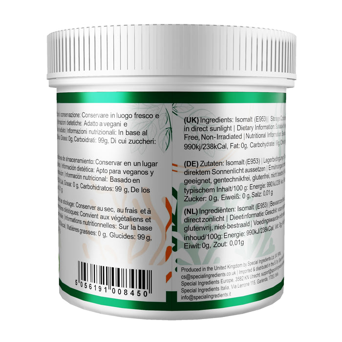 Isomalt Powder ( Premium Quality ): Isomalt is a type of sugar alcohol extracted from sugar and is only slightly over 2 calories per gram. It is odourless and very soluble. The solubility of Isomalt is 24g in 100g of solution which increases at higher temperatures. A great advantage of Isomalt is it absorbs no moisture at a temperature of 25°C and relative humidity of 85%. Hygroscopicity is lower than other sugar alcohols and sugar itself which makes Isomalt products very stable when stored. It has a high heat resistance and will not melt until it reaches 145°C and its chemical structure is not altered at normal cooking temperatures. Products made with Isomalt develop their full flavour enabling the user to make high boiled products with delicate flavours and aromas. Unlike other sugar alcohols Isomalt has no undesired cooling effect and can be used with any flavour. It is less sweet than sugar, with a sweetening power of approx. 60%, with no compromise to the natural flavour of sugar. Suitable for Vegans & Vegetarians, Non-GMO, Gluten Free, Non-Irradiated.