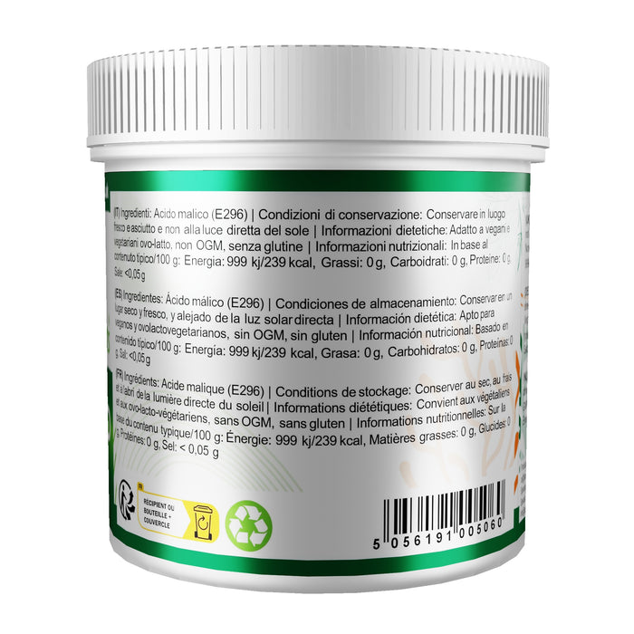 Malic Acid Powder: Malic Acid is a natural compound, which is the active ingredient in many sour or tart foods. It is tarter than either Ascorbic or Citric Acid. Malic Acid is a tart-tasting acid and is used to enhance flavour profiles. It is a natural substance that is found in fruits and vegetables, most associated with apples. Suitable for Vegans and Ova-Lacto Vegetarians, Non-GMO, Gluten Free.