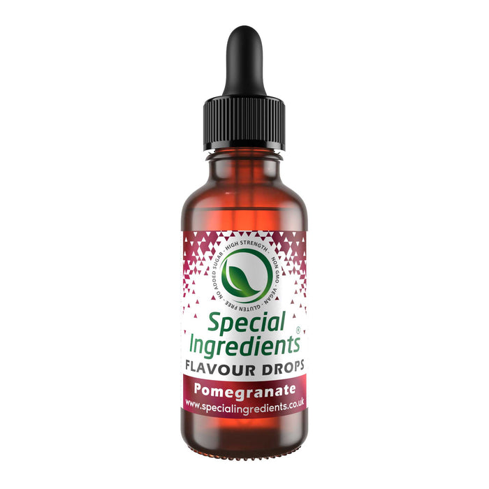 Pomegranate Food Flavouring Drop: Food Flavouring Drops are premium quality water soluble intense flavours which provide an exceptionally efficient method of adding flavour. They are a highly concentrated, versatile, multi-use product for both food and liquid. They should be used sparingly; 1-2 ml is ample to flavour 1 litre of base liquid. Each 30ml bottle contains approximately 800 drops. Food Flavouring Drops disperse well in most foods and drinks.They are ideal for flavouring cakes, icings, fondants, ice cream, sorbets, cupcakes, pastry, salads, sauces, frostings, ganache, desserts, cocktails, drinks, cream, wine, beer, spirits, sweets and more. They can also be used to enhance the flavour of a dish, without changing the texture of the original product. Allergen Free, Suitable for Vegans, Ovo-lacto Vegetarians & Vegetarians, Non-GMO, Gluten Free, No Added Sugar.