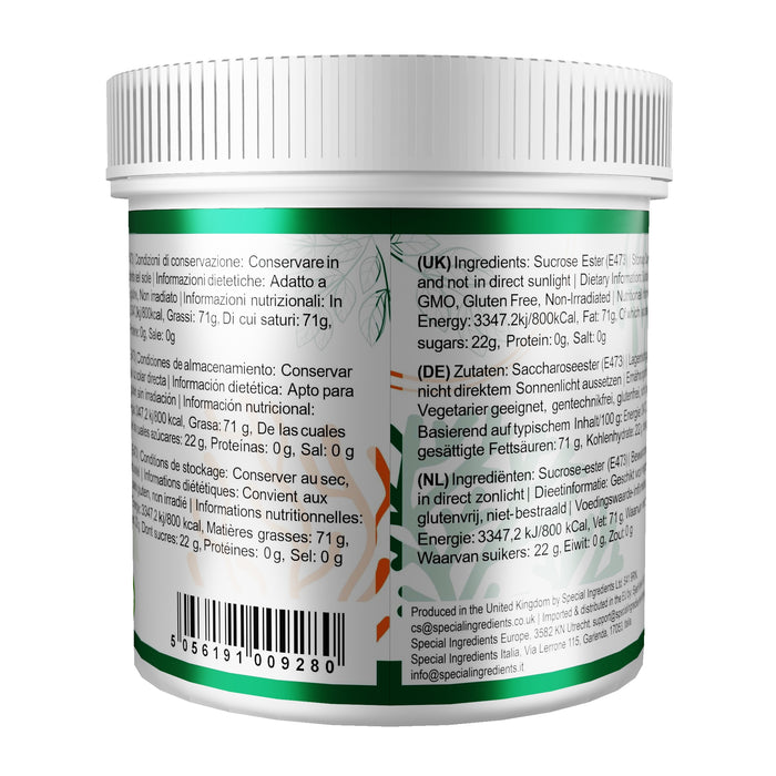 Sucrose Ester Powder: Our Sucrose Ester is in powder form. Sucrose Ester is obtained by esterifying sucrose with edible fatty acids from palm oil. It can be used as an emulsifier in virtually all food products including bakery, confectionery, cereals, dairy, ice cream and sauces. It is often used in low-fat alternatives to maximize the mouthfeel provided by fat. Sucrose Ester also provides a finer crumb structure and a softer texture in bakery products, stability in dairy or sauces, and improved texture and flavour in mousse and ice cream. In addition to emulsification, it has many other functions including aeration, texturization, protein protection and fat or sugar crystallization. Capable of foaming alcohols, it is unique in the way that it can boost other emulsifiers and improve the air bubble structure, prevent proteins from browning, keep starches from early stalling, prevent fat bloom in chocolate, and accelerate crystallization in fine-grained sugar confection. Suitable for Vegans & Vegetarians, Non-GMO, Gluten Free, Non- Irradiated.