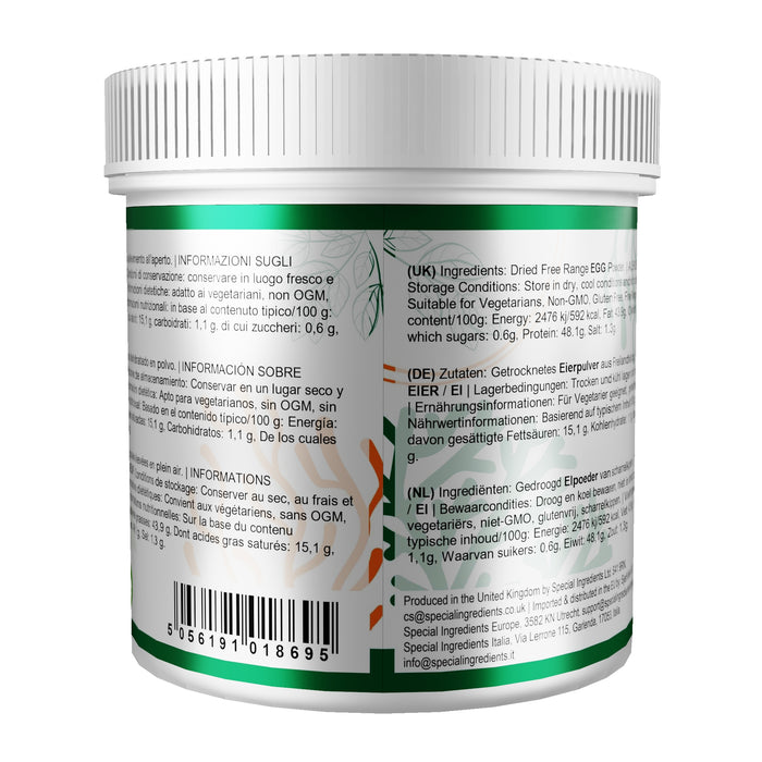 Whole Egg Powder: Our Egg Powder is a premium quality free-range egg powder derived from free range chicken eggs. It can be used for shakes, smoothies, cakes, brownies, sponges, muffins, omelettes, protein bars and is excellent for making icing. High in protein, its a perfect product for a healthy lifestyle. Reconstitution ratio 100g of powder dissolved into 300ml (300g) of water = 400g of liquid egg (approx. 8 eggs). Suitable for Vegetarians, Non-GMO, Gluten Free, Free Range.